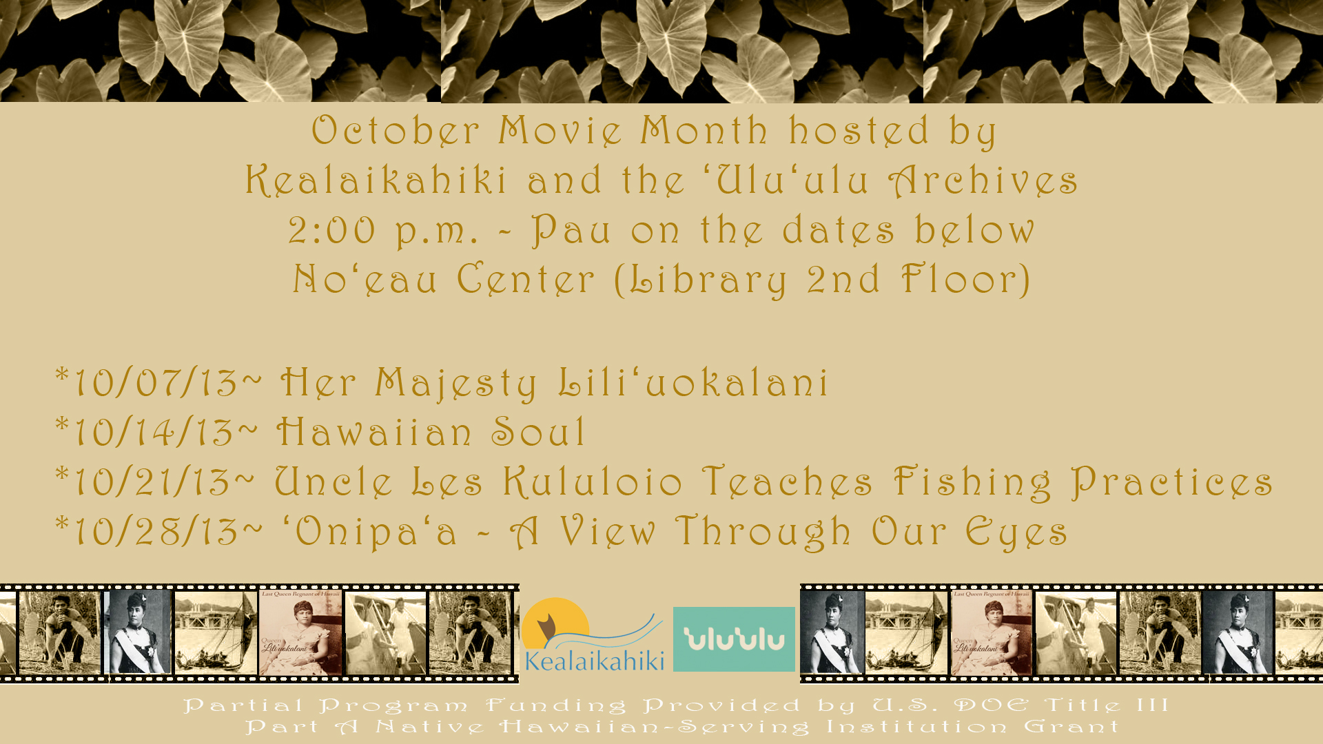 In collaboration with Kealaikahiki: Native Hawaiian Program, ʻUluʻulu will co-host “October Movie Month Mondays,” to promote Hawaiian culture and identity for Hawaiian and non Hawaiian students. These events perpetuate Kealaikahiki’s mission which strives to promote “student success while being culturally responsive to the indigenous culture of Hawaiʻi, including culturally relevant ways of knowing.” A film from the the archive will be shown every Monday of October (Oct.7, 14, 21, 28) at two PM in the Noʻeau Center. See flyer above for film titles.