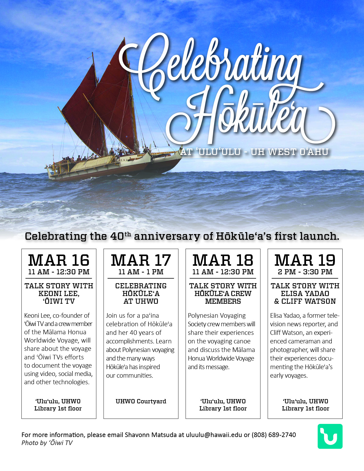 To celebrate Hōkūleʻa’s 40 years of accomplishments and to promote the mission of the Mālama Honua World Wide Voyage, ʻUluʻulu will be hosting a talk story series and a pā‘ina celebration at UH West Oʻahu March 16-19. All events are open to the public, we hope you will be able to join us!