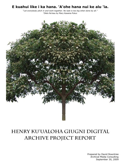 I am happy to announce that the “Henry Ku’ualoha Giugni Digital Archive Project Report” has been completed. The report looks at the status of moving image preservation in Hawai’i, highlighting the urgency for action. The report also provides some guidelines that are to act as a “blueprint” for the establishment of a new archive and program. A survey was also conducted and is included in the report. I want to thank the many people involved who very generously gave of their time and insights.